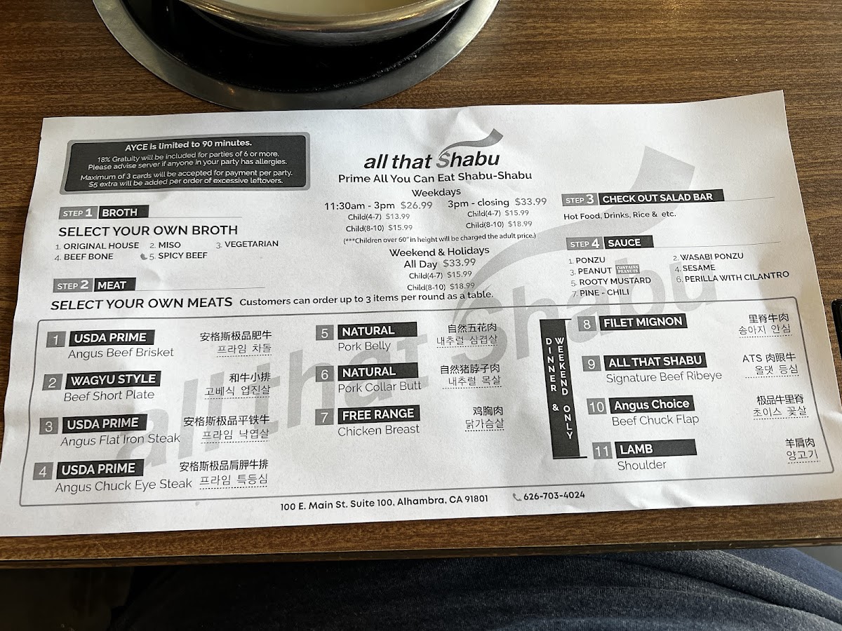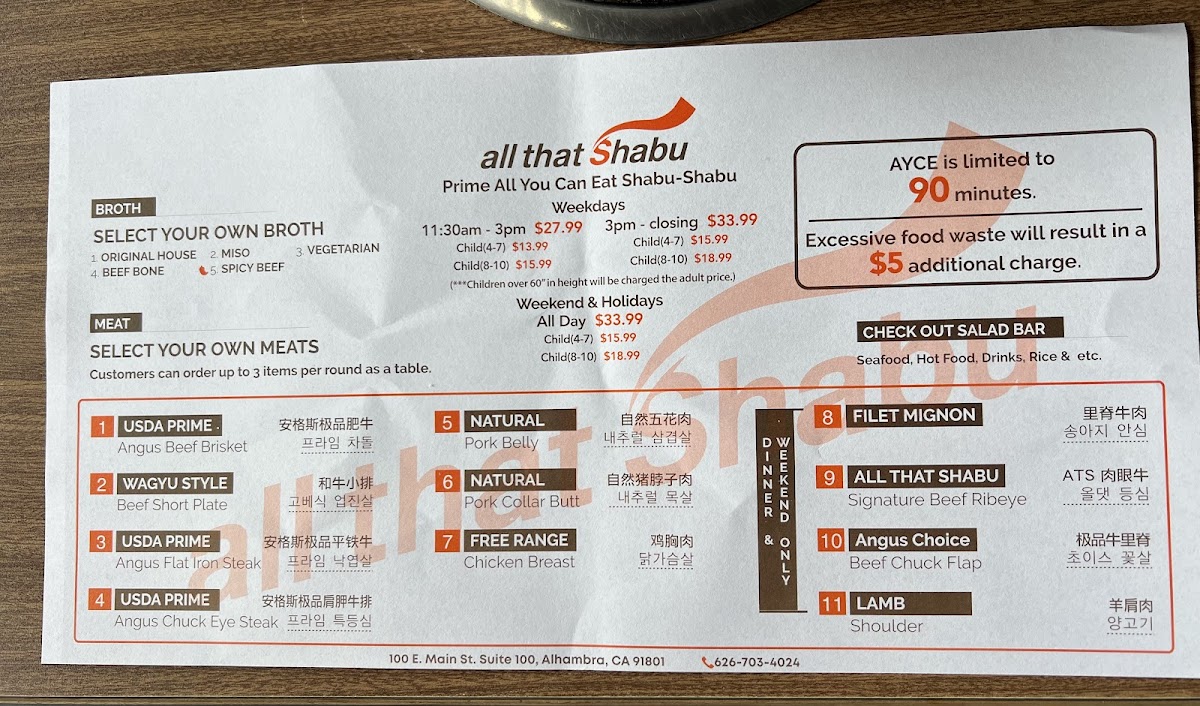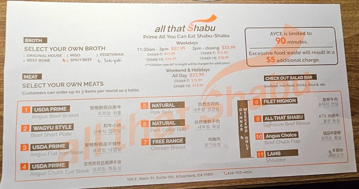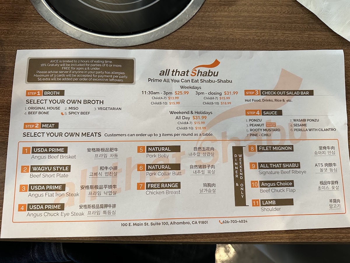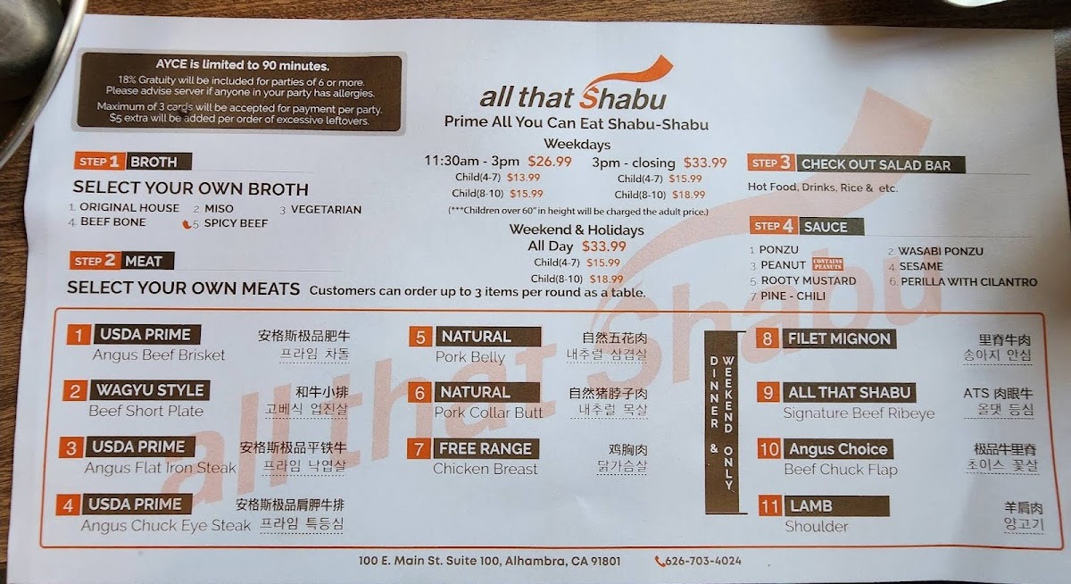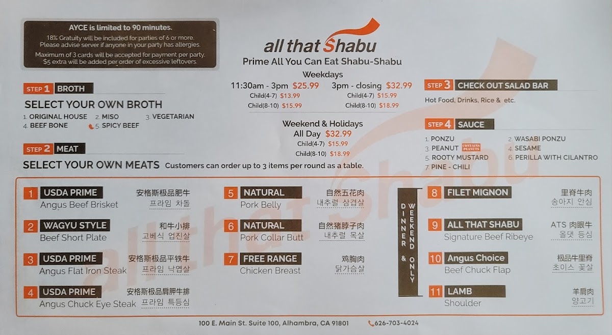 For an unbeatable shabu experience, head to All That Shabu at 100 E Main St, Alhambra, CA 91801. With a promise of variety, freshness, and a fun atmosphere, this buffet restaurant is ready to satisfy your cravings. Prepare to enjoy a 90-minute culinary adventure that is sure to fulfill your taste for both adventure and indulgence!