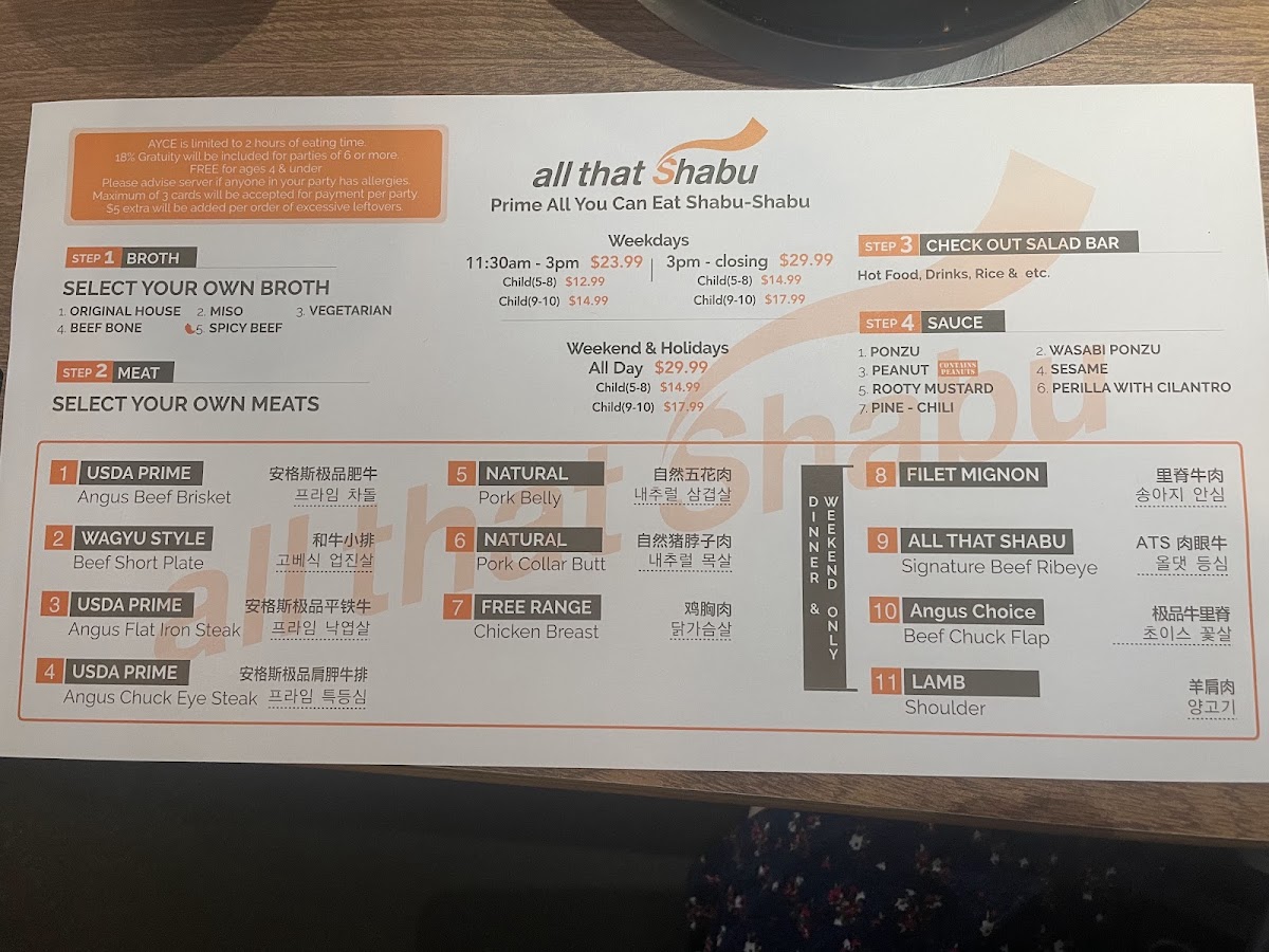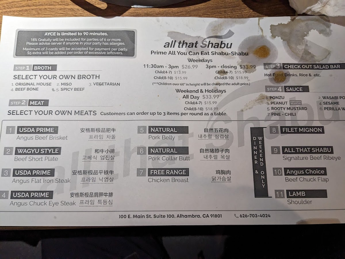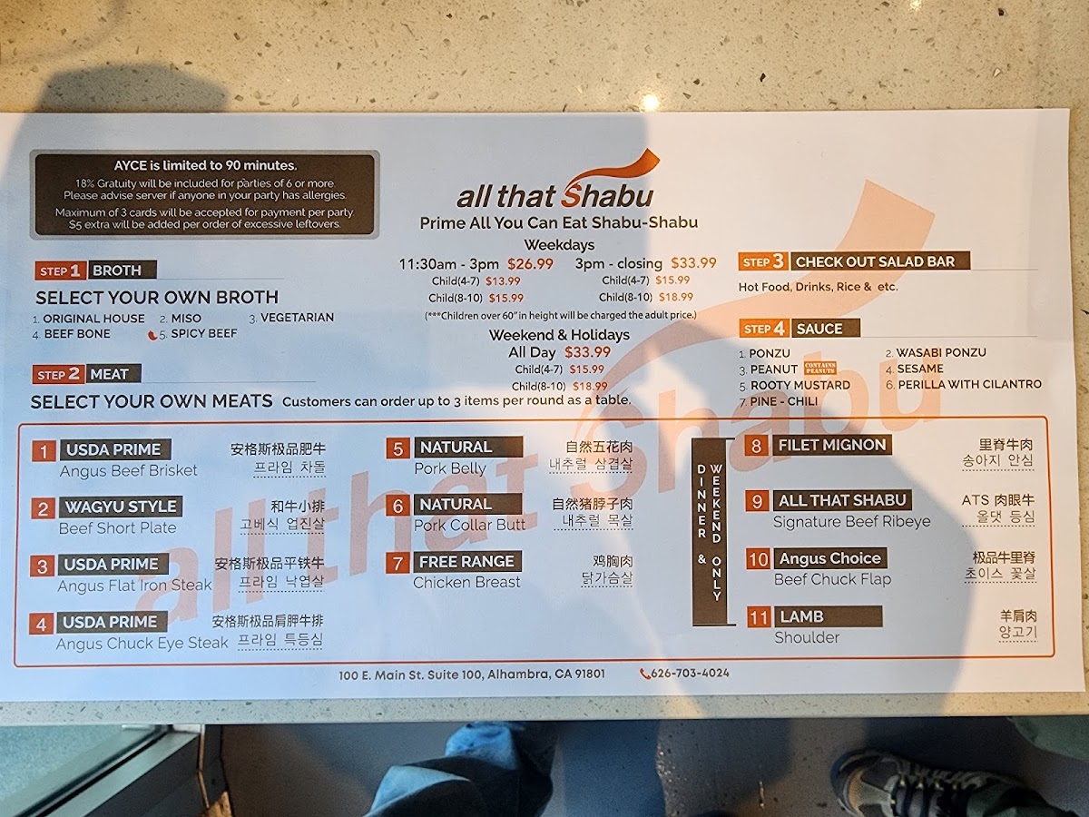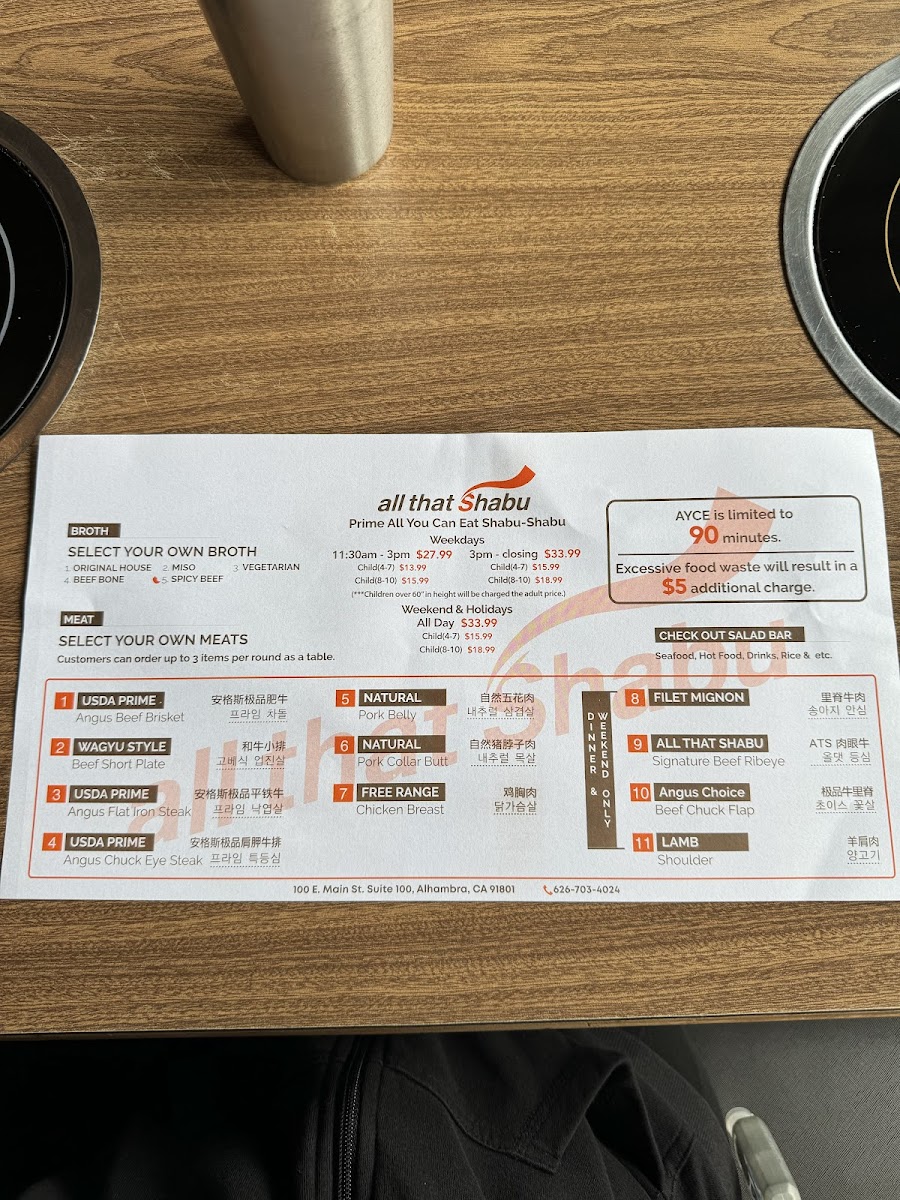 For an unbeatable shabu experience, head to All That Shabu at 100 E Main St, Alhambra, CA 91801. With a promise of variety, freshness, and a fun atmosphere, this buffet restaurant is ready to satisfy your cravings. Prepare to enjoy a 90-minute culinary adventure that is sure to fulfill your taste for both adventure and indulgence!